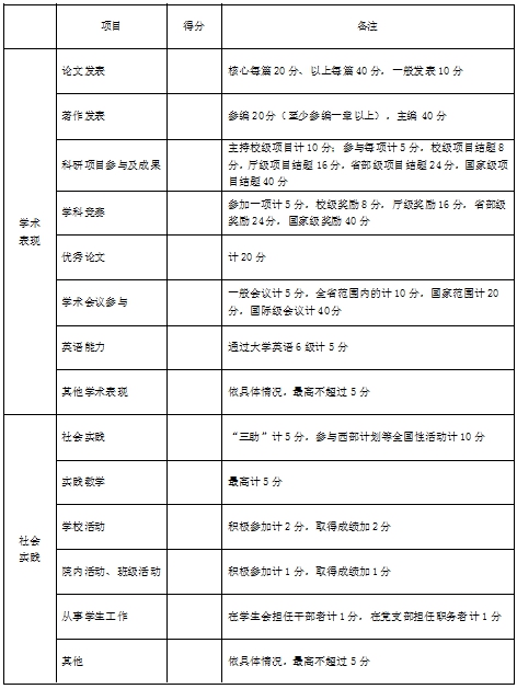 5.研究生三年级学生学业奖学金评定条件和办法:学业成绩合格,符合学术条件;学术表现分数(详见附表一)占总分的80%,界定范围为1—6学期(已申请过的学术方面成果不再计入);社会实践分数(详见附表一)占总分的20%,界定范围为4—6学期。